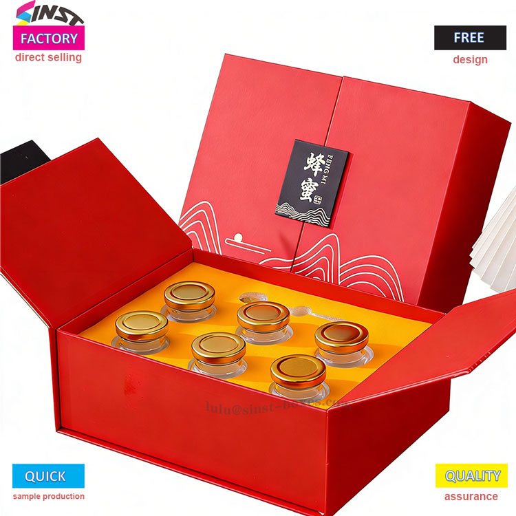 Diese rote Honig-Geschenkbox kombiniert elegante Wellenmuster mit hochwertigem Hartkarton und verfügt über eine faltbare Struktur für einfache Lagerung und Transport. Die Honig-Geschenkbox ist für verschiedene Glasgrößen geeignet (für Honig/Tonic) und wird mit einem maßgeschneiderten Schaumstoffeinsatz zur Aufnahme des Inhalts geliefert. Sehr gut geeignet für Weihnachtsgeschenke, Geschäftsgeschenke und Verpackungen für Gesundheitsprodukte, entsprechend den Geschenkpräferenzen auf den europäischen, amerikanischen und südostasiatischen Märkten. Diese Box ist leicht, stilvoll und kostengünstig und erhöht gleichzeitig den Produktwert.