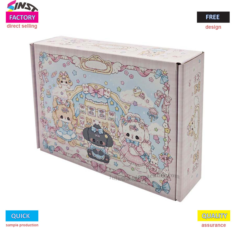 Die farbenfrohe Wellpapierflugzeugkiste für Kleidung verfügt über ein süßes rosa Farbschema mit hellblauen Akzenten. Die Schachtel ist mit Cartoonelementen wie Blumengirlanden, kleinen Tieren, Bögen, Wolken und Herzen gefüllt, die einen verträumten und niedlichen Stil schaffen. Vom Aussehen bis zum Service ermöglicht es die Verpackung der Kleidung in vollem Umfang und verbessert die Markenattraktivität.