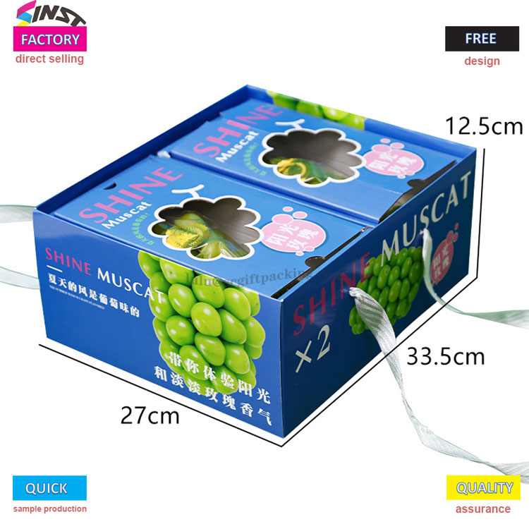 Fruit Universal Handheld Gift Box für Trauben ist eine universelle Handgeschenkschachtel, die speziell für Traubengeschenke entwickelt wurde und für mehrere Szenarien wie Sonnenschein Rosen geeignet ist! Der Hauptkörper bietet vier Farben zur Auswahl: hellgrün, hellgrün, blau und weiß. Die Oberfläche wird mit dem "Sunshine Rose" -Mustern und dem "100% frischen" und "natürlichen" Logos gedruckt, gepaart mit einem kreisförmigen Griffloch/grünen Tragband, wodurch sie tragbar und schön ist.