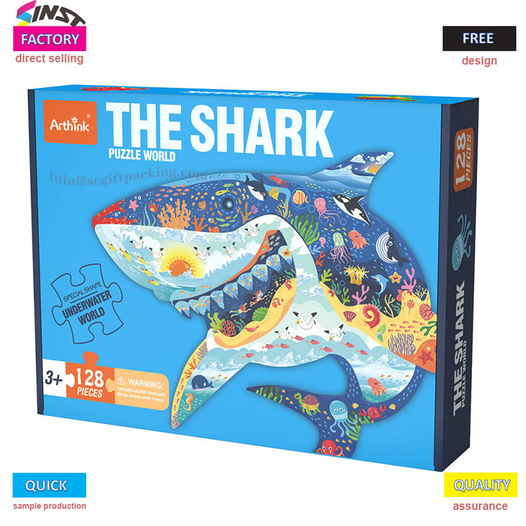 Letzte Woche traf ich Zhang Jie in der Ausstellungshalle. Sie hielt den HaiPuzzle-GeschenkboxSie hatte es gerade erhalten und rief glücklich aus: „Mein Kind öffnete es und rief: ‚Mama, schau mal! Die Zähne eines großen Hais werden leuchten!‘“ Als sie in die Richtung schaute, in die sie zeigte, war der ganze Körper des Hais auf der blauen Geschenkbox mit kleinen Fischkorallen bedeckt, und nach dem Zusammensetzen von 128 Puzzleteilen sah er aus wie ein schwimmender „Unterwasserkönig“ – das ist unsere neu eingeführte THE SHARK PUZZLE WORLD, die auch die farbenfrohe Alien-Geschenkbox auf dem Bild ist.