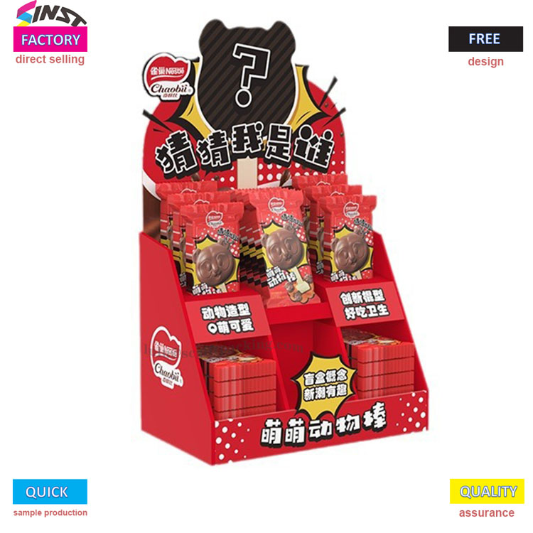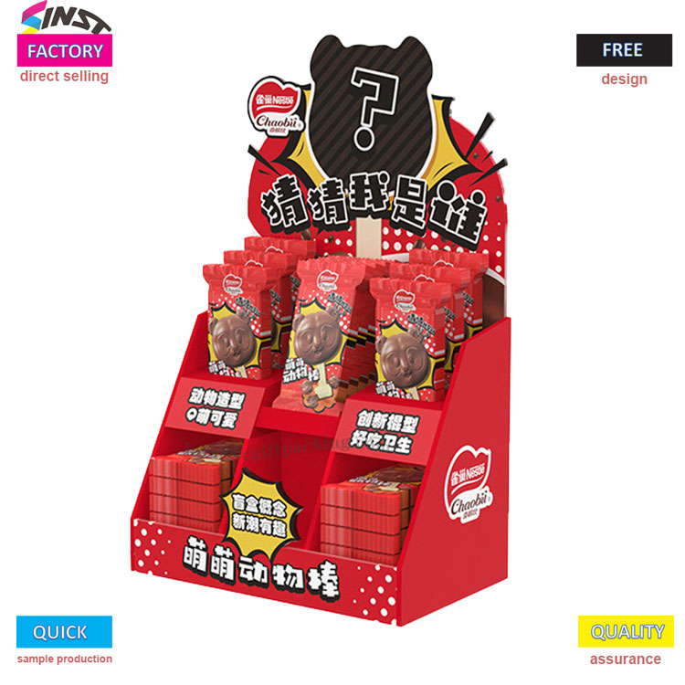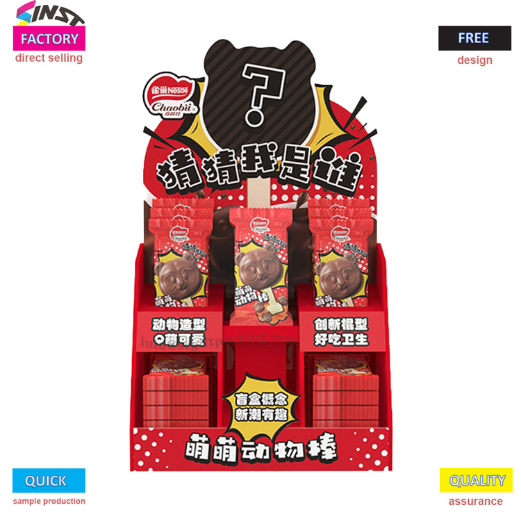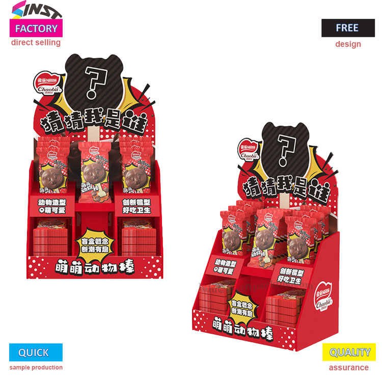 Dieses PDQ-Display-Box von PET Snack Cardboard verfügt über eine hohe Sättigung rot als Hauptfarbe und ist mit visueller Auswirkungen ausgestattet. Dadurch wird es zu einem auffälligen Werkzeug für Terminalanzeigen. Der lustige Slogan "Ratet, wer ich bin" auf der Oberseite des Box stimuliert die Neugier der Verbraucher; Das Innenraum nimmt eine mehrschichtige Schichtstruktur an, die ordentlich tierförmige Snackverpackungen (in Form von Lutscher) zeigt.