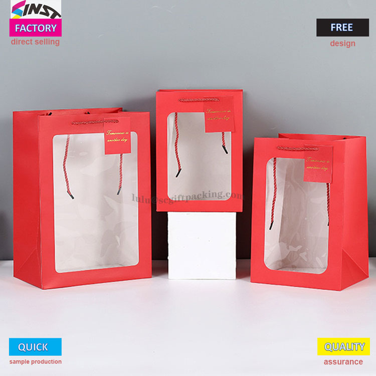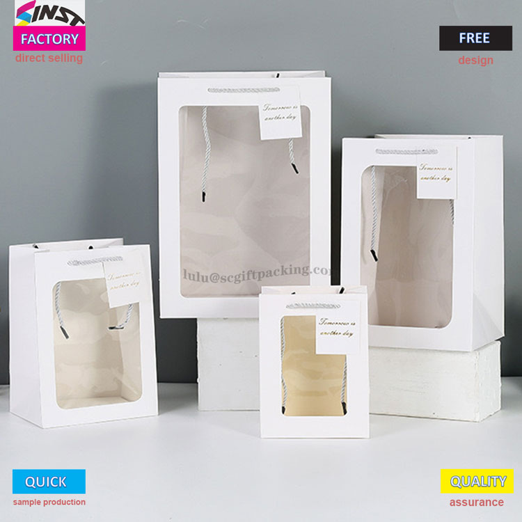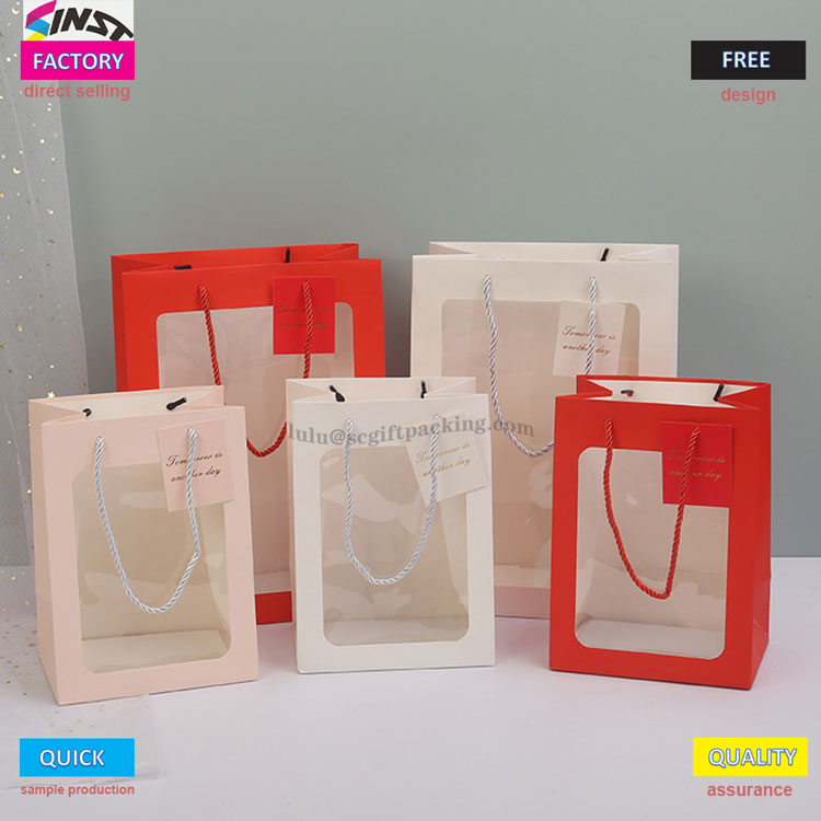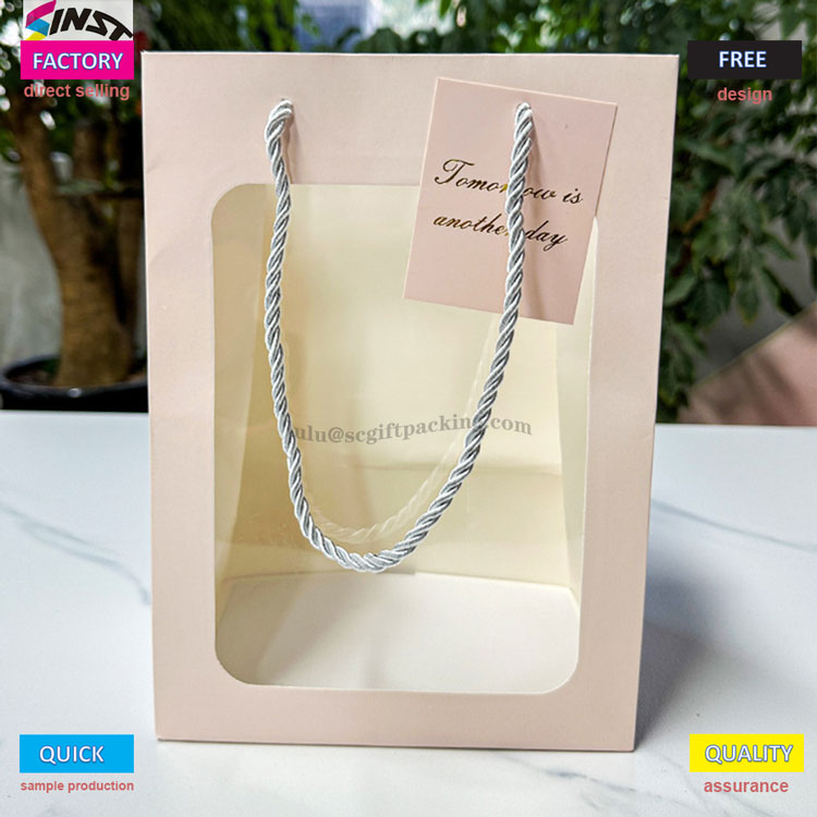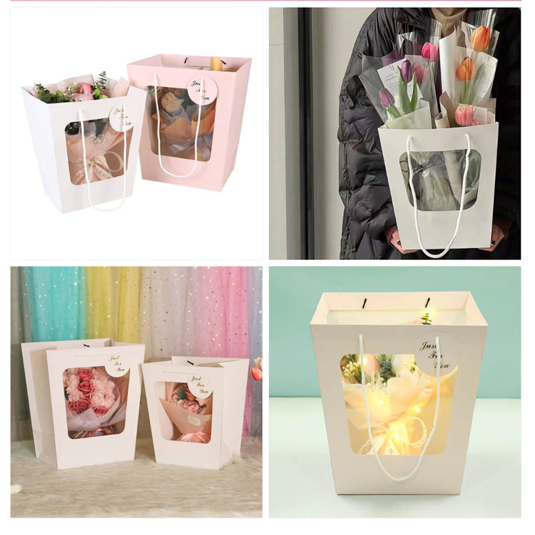 Haben Sie Angst, Blindkisten zu öffnen, wenn Sie Geschenke geben? Diese Handtasche verfügt über ein transparentes Fensterdesign, mit dem der Geschenksäule klar präsentiert werden kann und einen komfortablen Griff bietet, was es zu einem visuellen Highlight macht. Das transparente PVC -Fensterdesign kann köstliche Backkreationen und -geschenke wie Kuchen, Kekse, Macarons usw. zeigen. Das Bouquet -Fensteröffnungs -Tasche kann auch Ihre schöne Produkte Familie und Freunden mit maßgeschneiderten Karten präsentieren. Handgeschriebene Segen füllen die Atmosphäre sofort mit exklusiver Zeremonie. Geschenke für Geburtstage, Feiertage und Jubiläen können sowohl mit Aussehen als auch mit Absicht gegeben werden. Natürlich ist die Blumenkörperbeutel auch eine gute Wahl für den täglichen Lagerung.